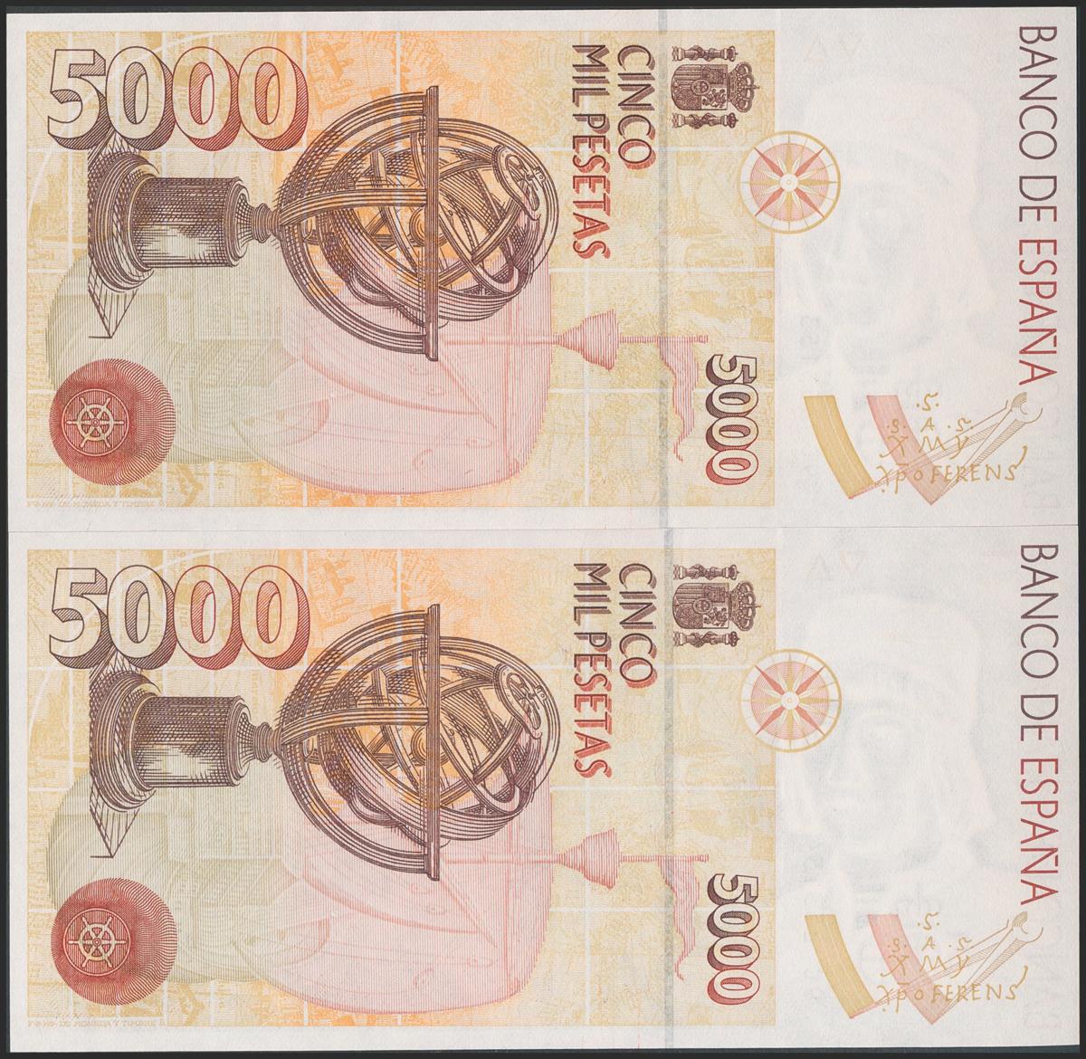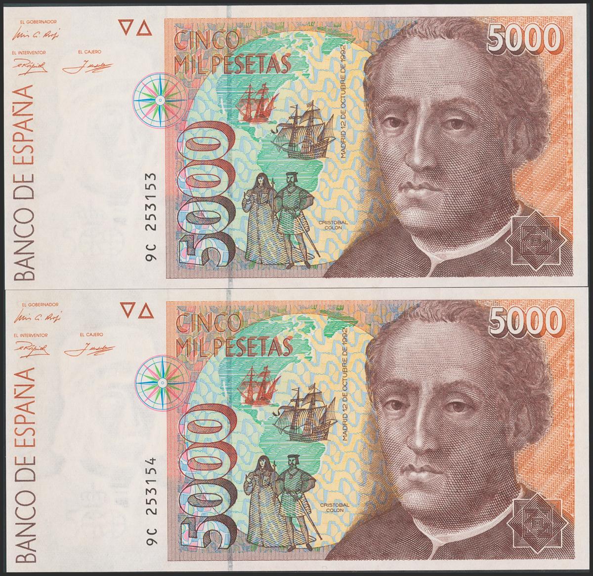 5000 Pesetas. 12 de Octubre de 1992. Pareja correlativa. Serie 9C, numeración especial. (Edifil 2017: 484b). SC.