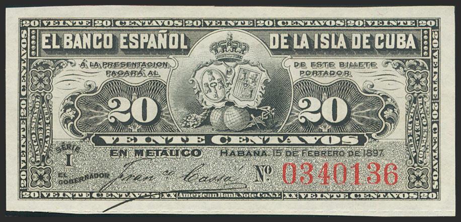 BANCO ESPAÑOL DE LA ISLA DE CUBA. 20 Centavos. 15 de Febrero de 1897. Serie I. (Edifil 2021: 85). Apresto original. SC.