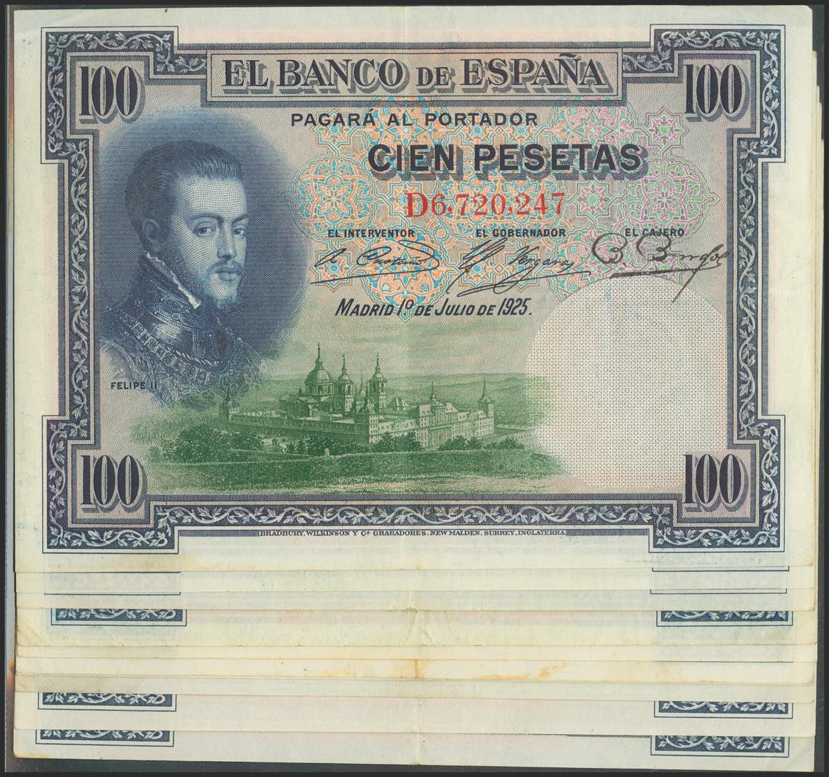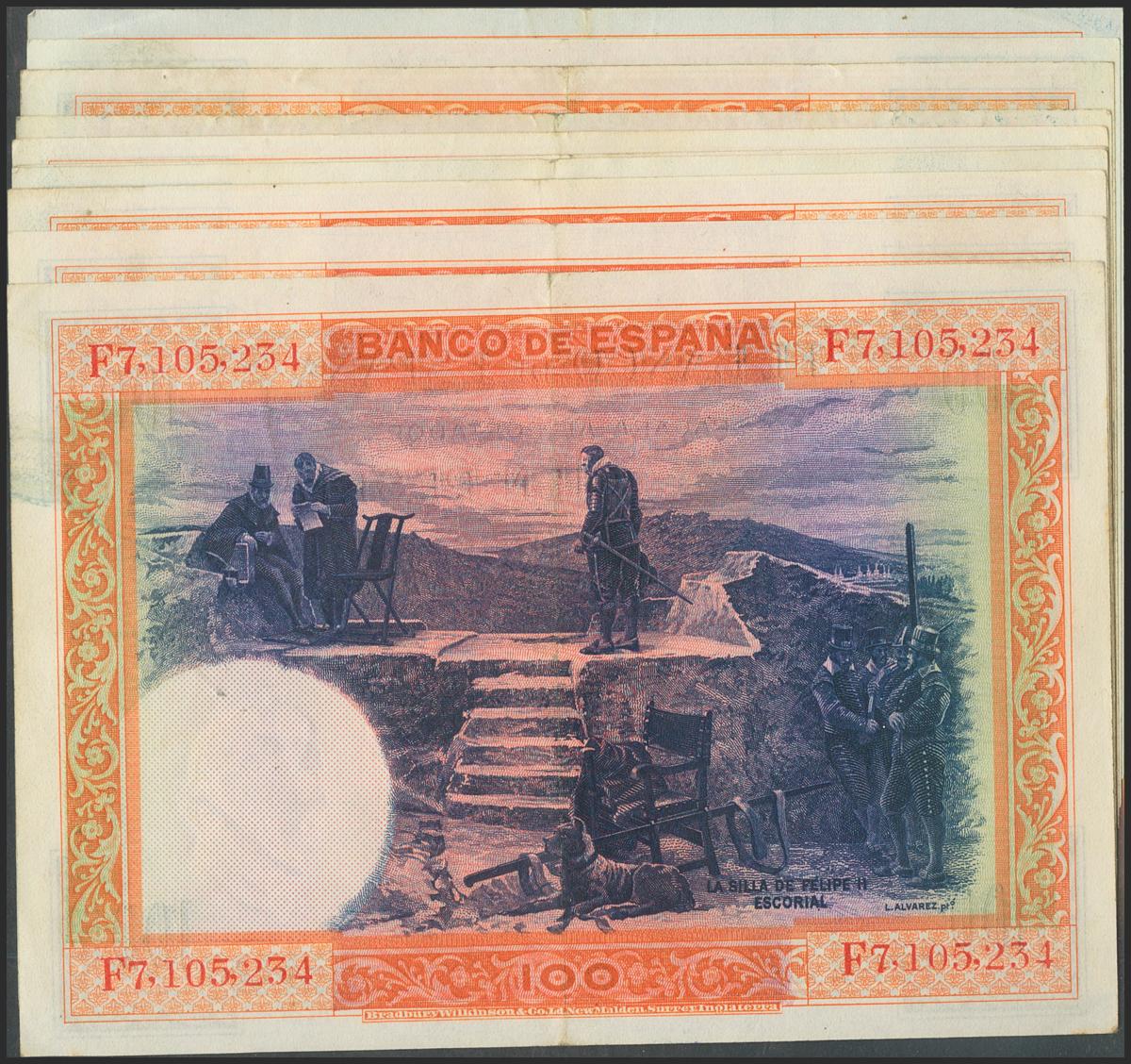 Conjunto de 10 billetes de 100 Pesetas emitidos el 1 de Julio de 1925, con las series D, E y F. (Edifil 2021: 350). EBC/MBC.