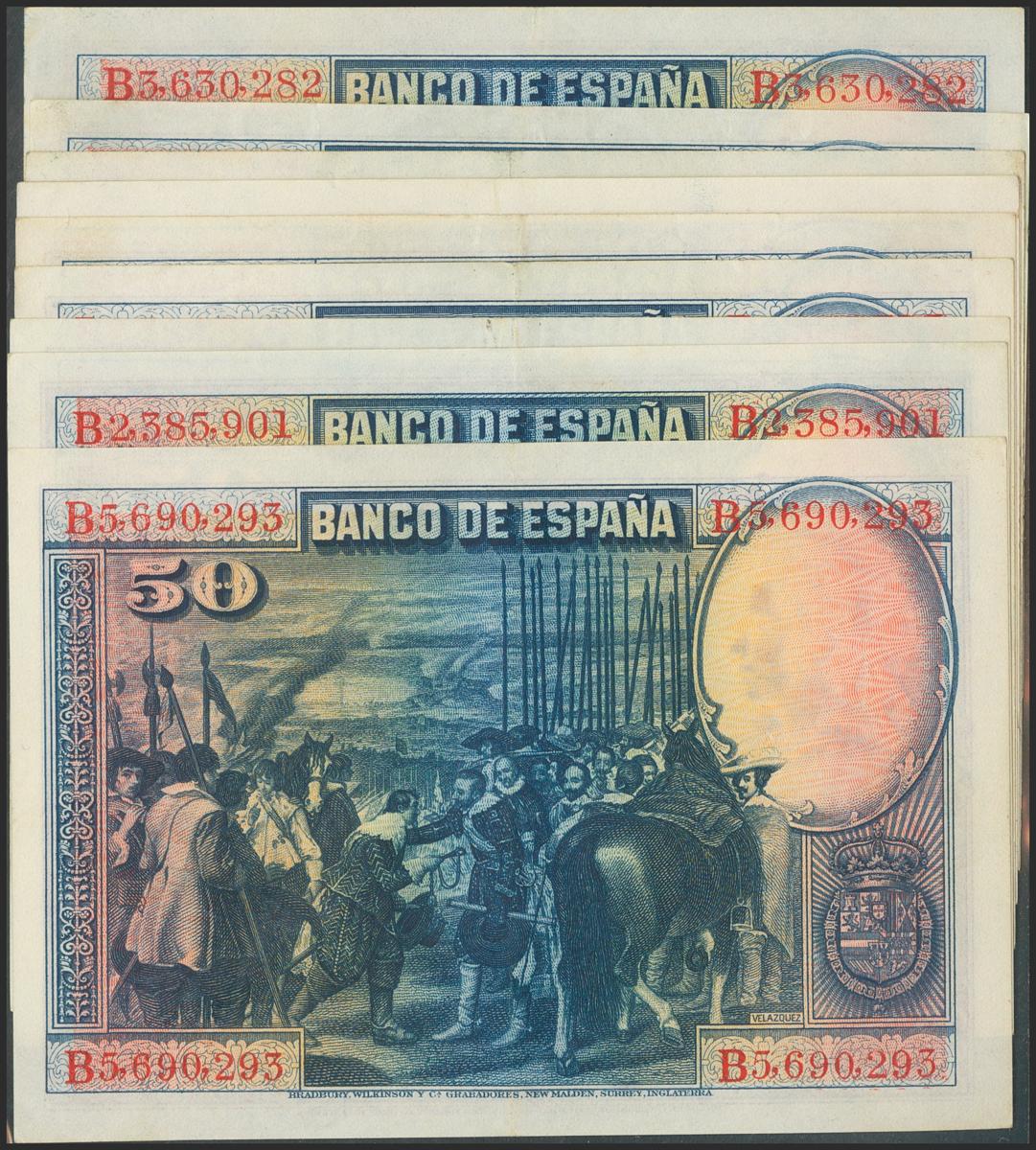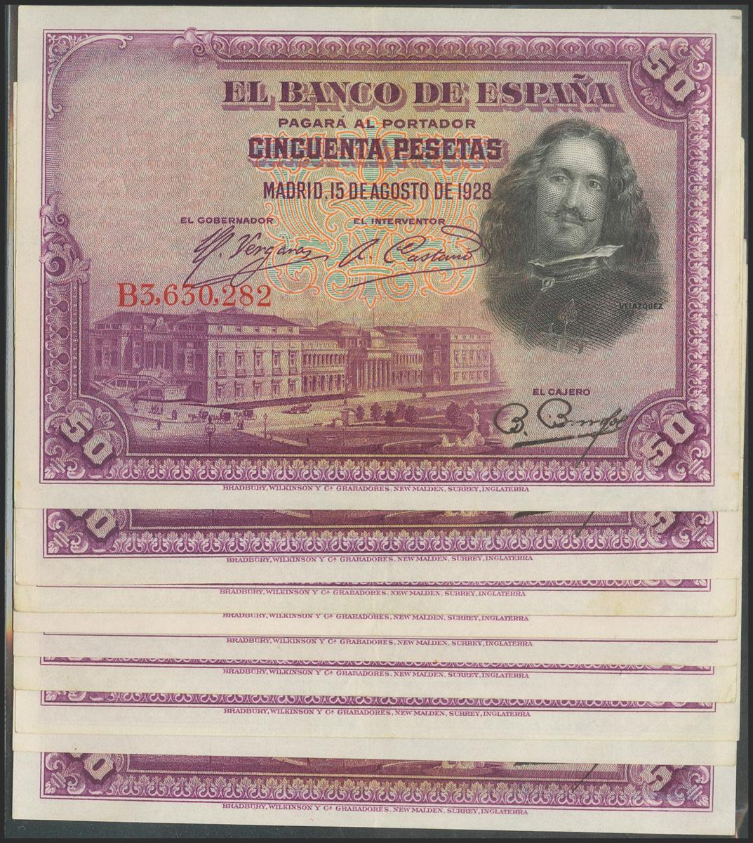 Conjunto de 10 billetes de 50 Pesetas emitidos el 15 de Agosto de 1928, con la serie B (Edifil 2021: 354). EBC/MBC+.