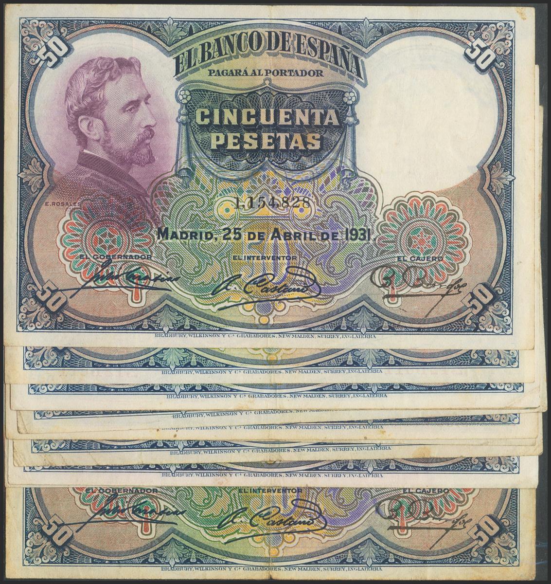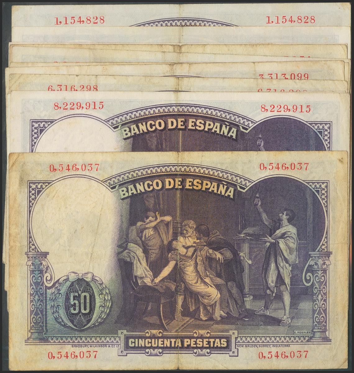 Conjunto de 11 billetes de 50 Pesetas emitidos el 25 de Abril de 1937, sin serie (Edifil 2021: 359). MBC+/BC++.