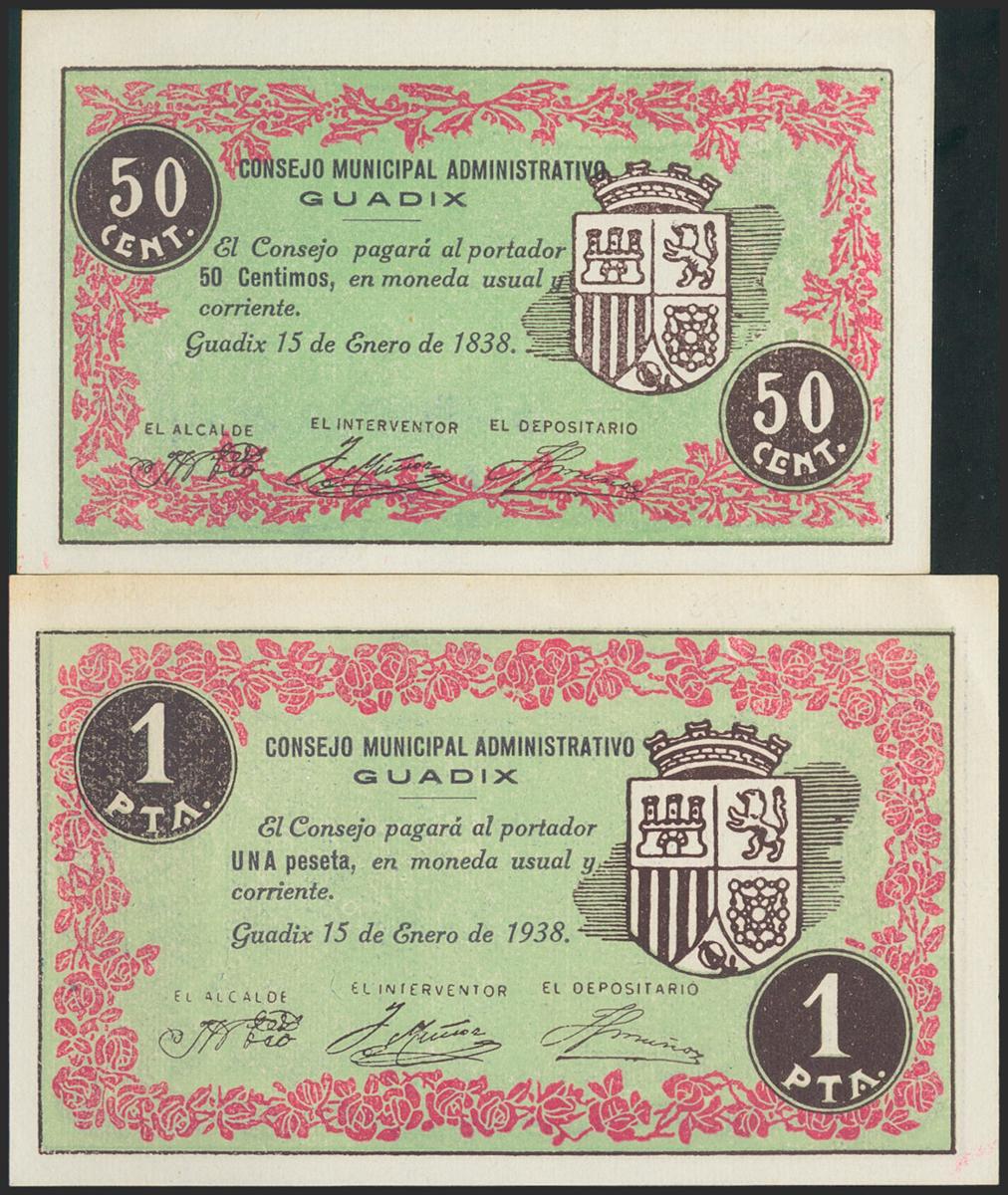 GUADIX (GRANADA). 50 Céntimos y 1 Peseta. 1 de Enero de 1937. (González: 2771, 2772). SC.