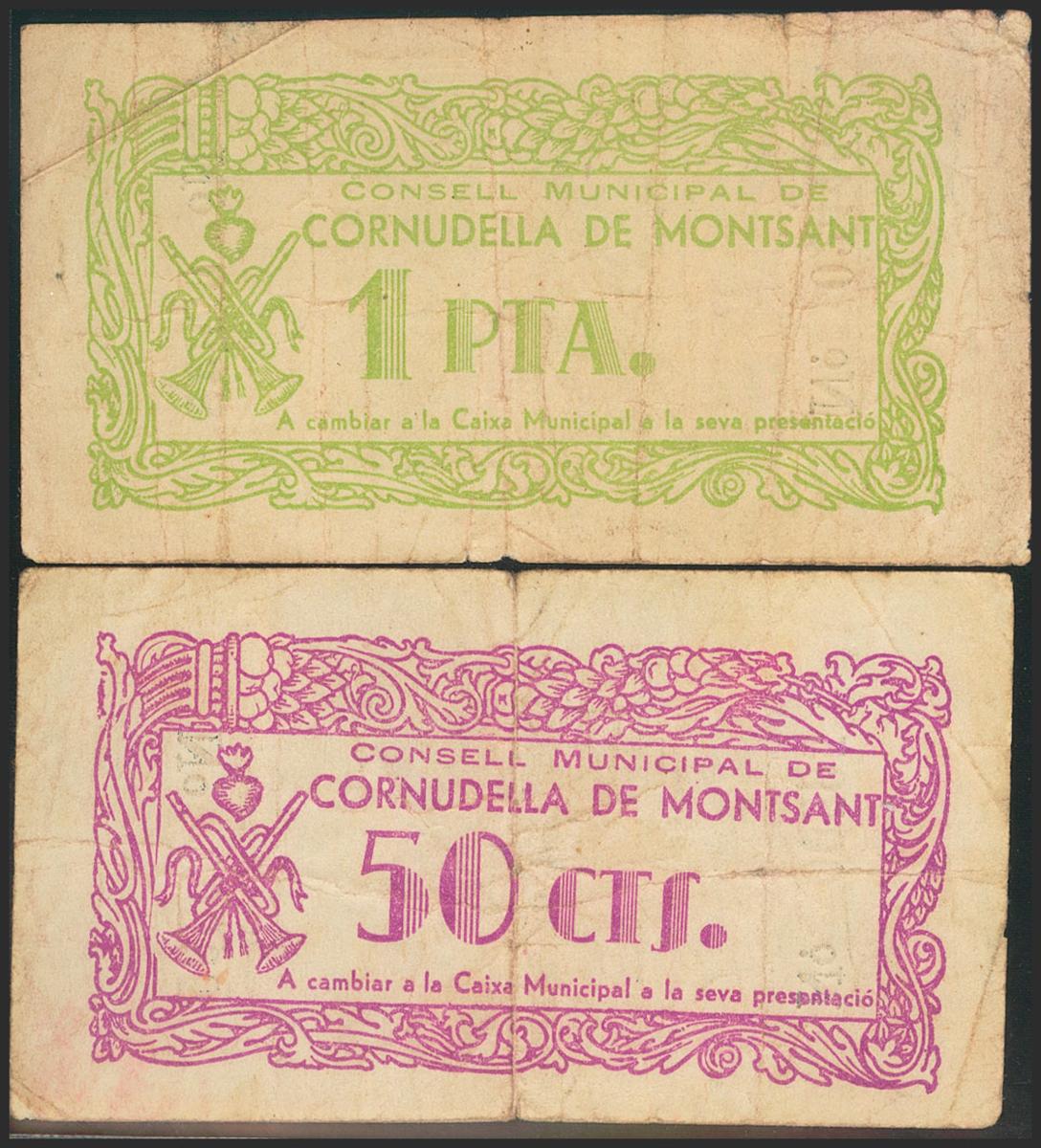 CORNUDELLA DE MONTSERRAT (TARRAGONA). 50 Céntimos y 1 Peseta. (1937ca). (González: 7698, 7699). Muy raros. MBC.