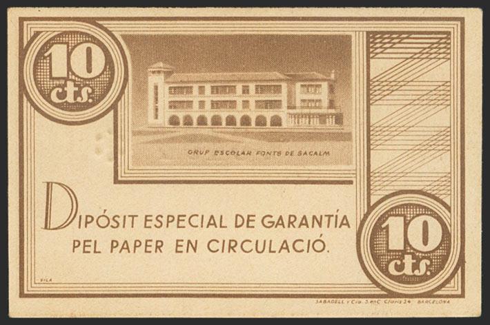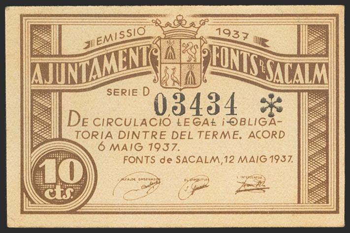 FONTS DE SACALM (GERONA). 10 Céntimos. 12 de Mayo de 1937. Serie D. (González: 7916). EBC+.