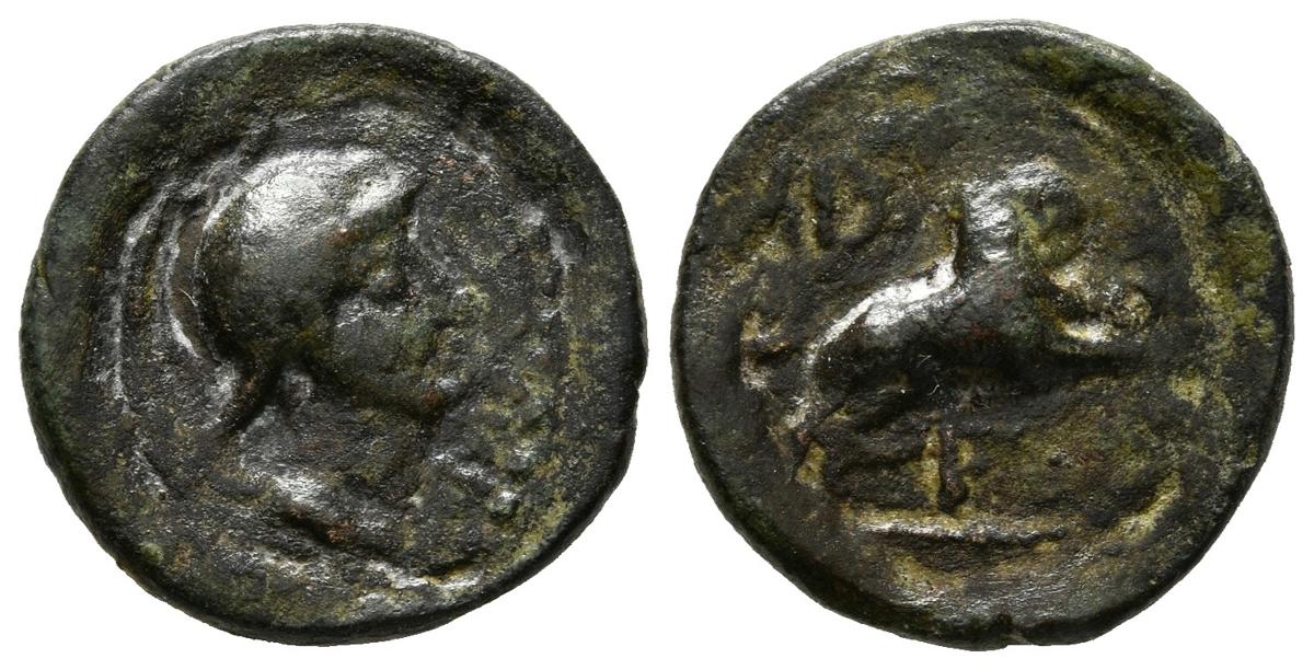 GALIA, Massalia. Ae15. (Ae. 2,04g/15mm). 49 a.C. (¿MHN 81?). Anv: Cabeza femenina con casco a derecha, delante leyenda: ¿MAS?. Rev: León rampante a derecha. MBC-. Escaso.