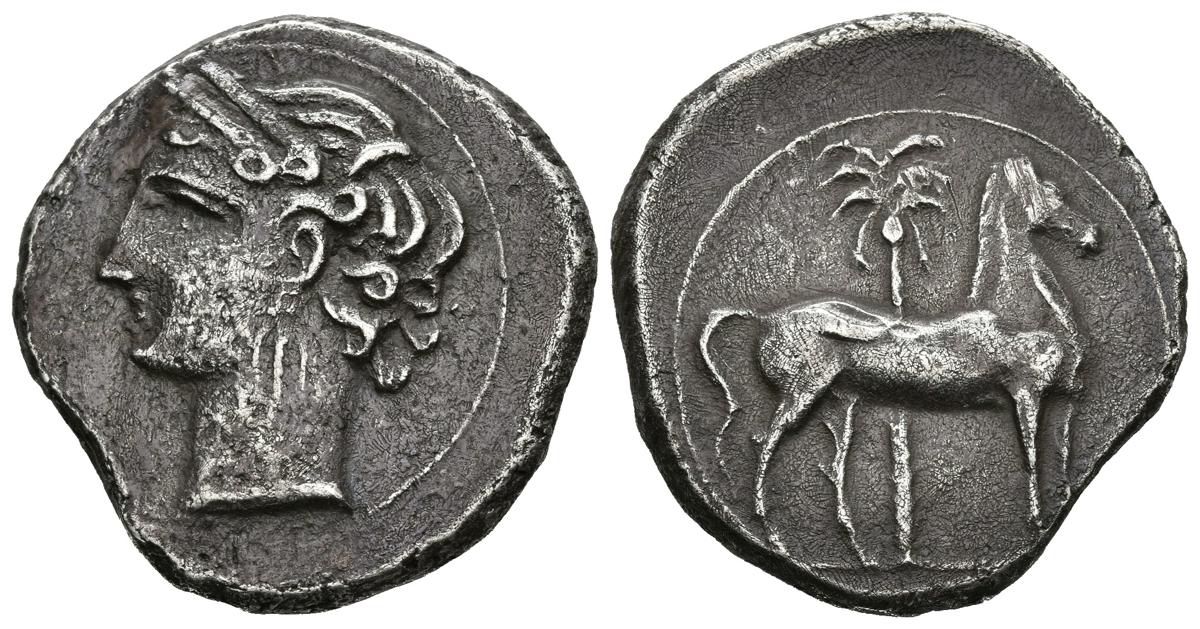 CARTAGONOVA (Cartagena, Murcia). Shekel. (Ar. 6,91g/24mm). 220-215 a.C. (FAB-501). Anv: Cabeza de Tanit a izquierda. Rev: Caballo parado a derecha, detrás palmera. MBC+. Raro. Cospel faltado.