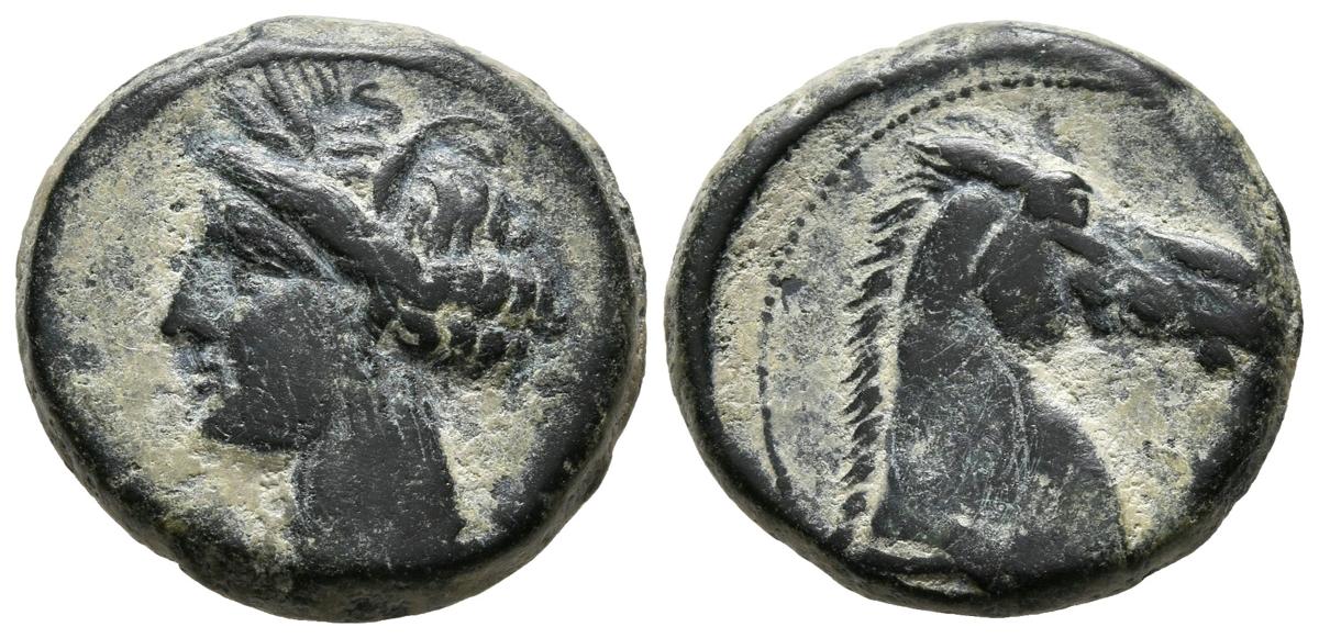 CARTAGONOVA (Cartagena, Murcia). Calco. (Ae. 6,52g/20mm). 220-215 a.C. (FAB-510). Anv: Cabeza de Tanit a izquierda. Rev: Cabeza de Caballo a derecha. MBC.