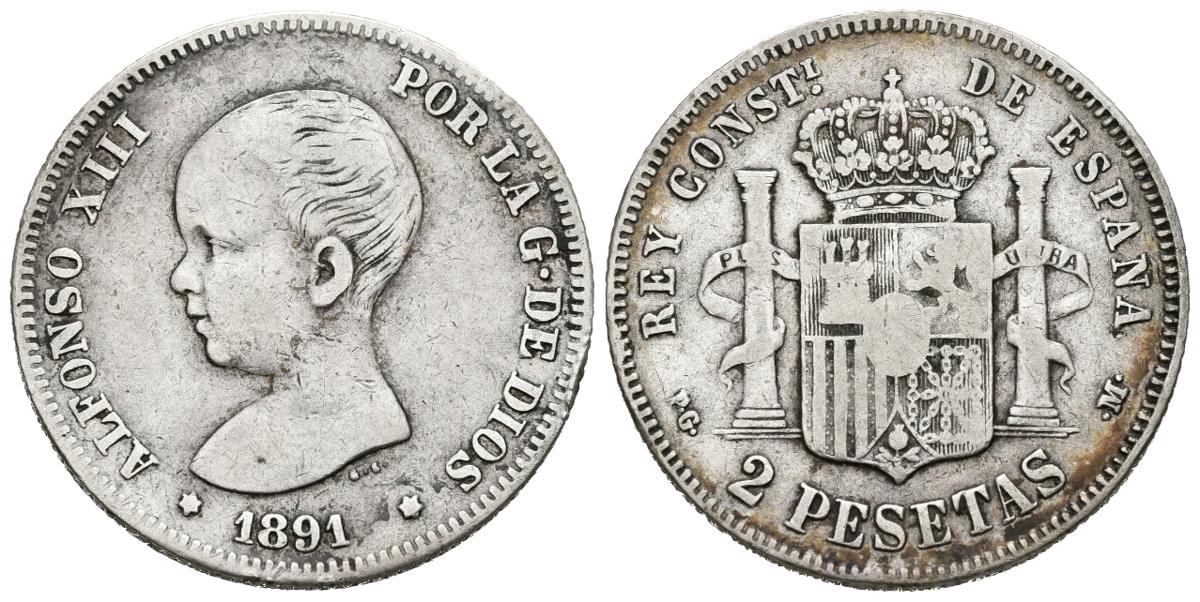 ALFONSO XIII (1885-1931). 2 Pesetas (Ar. 9,82g/27mm). 1891 *18-91. Madrid PGM. (Cal-2019-84). BC+/BC. Estrellas no visibles. Escasa.