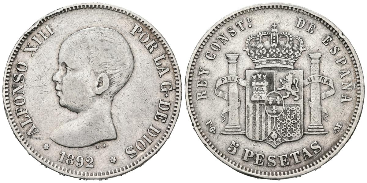 ALFONSO XIII (1885-1931). 5 Pesetas (Ar. 25,01g/37mm). 1892 *18-92. Estrellas parcialmente visibles. Madrid PGM. (Cal-2019-99). MBC. Golpecitos en el canto. Rayitas de limpieza.