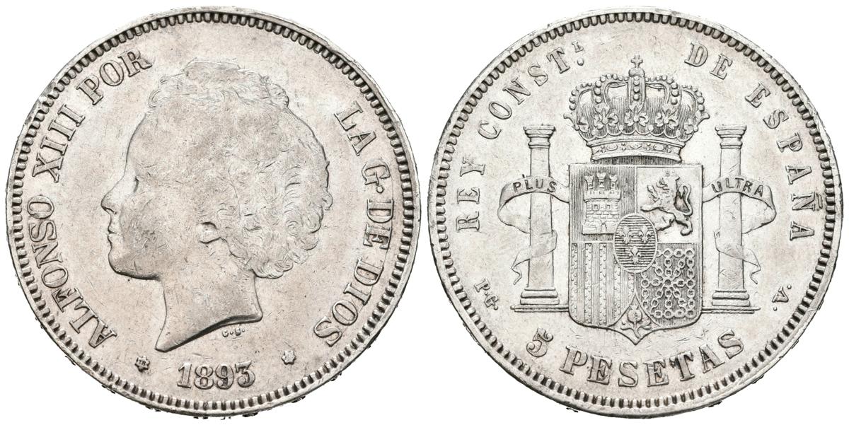 ALFONSO XIII (1885-1931). 5 Pesetas (Ar. 24,92g/37mm). 1893 *18-93. Madrid PGV. (Cal-2019-103). MBC. Segunda estrella no visible. Escasa.