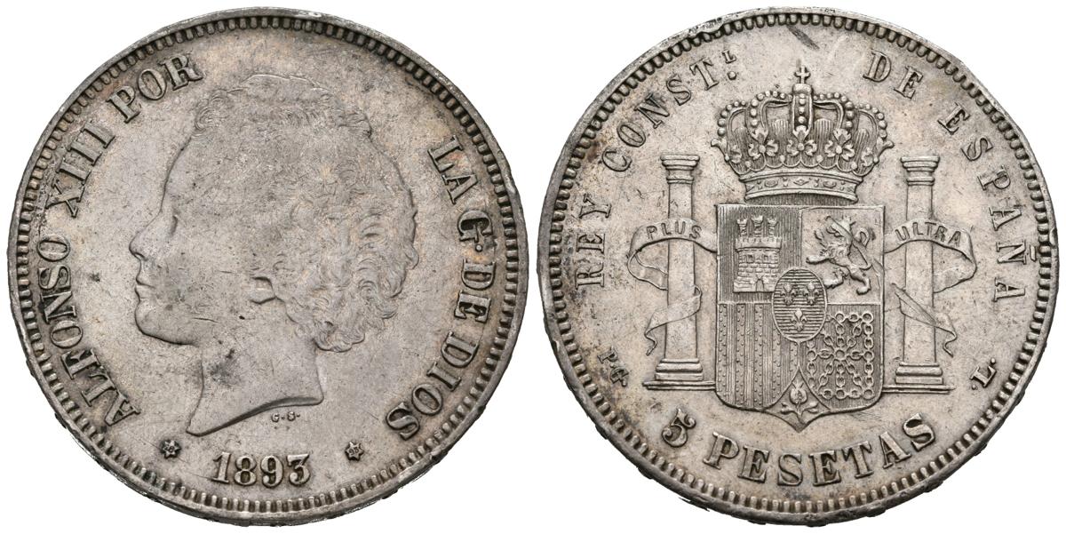 ALFONSO XIII (1885-1931). 5 Pesetas (Ar. 25,04g/37mm). 1893 *18-93. Madrid PGL. (Cal-2019-102). MBC+. Golpecitos en el canto. Raya en reverso. Bonito tono.