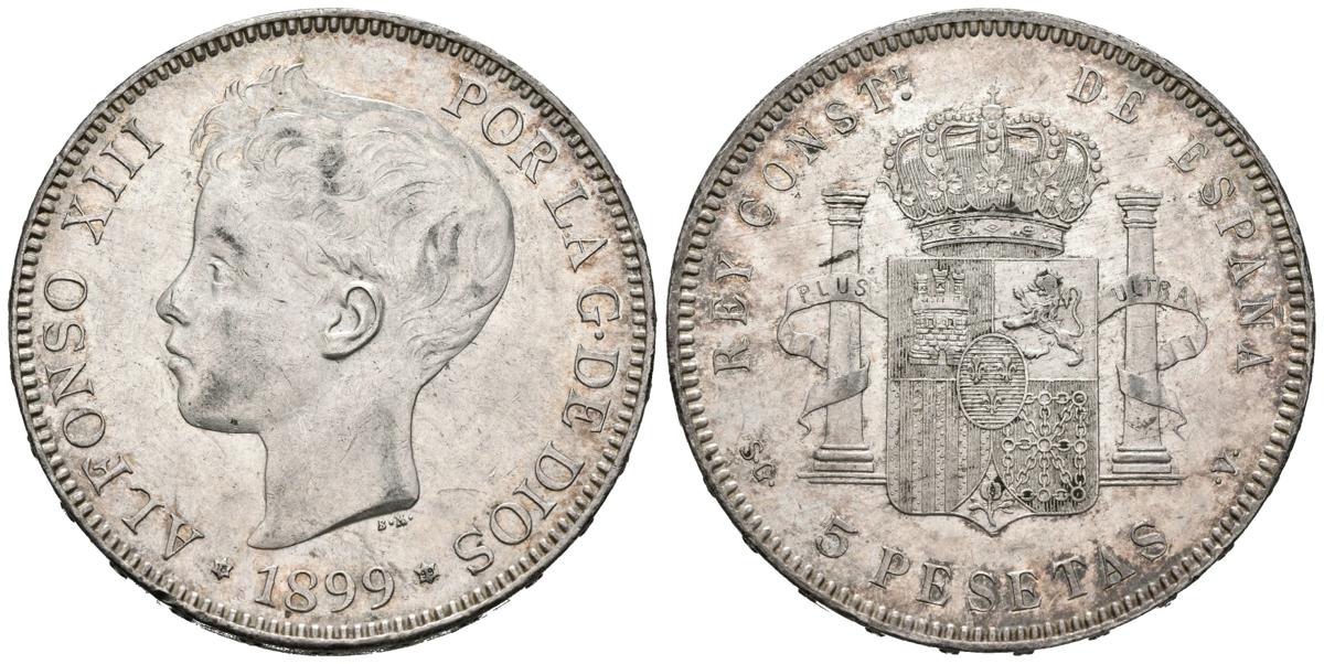 ALFONSO XIII (1885-1931). 5 Pesetas. (Ar. 25,13g/37mm). 1899 *18-99. Madrid SGV. (Cal-2019-110). SC-. Brillo original.