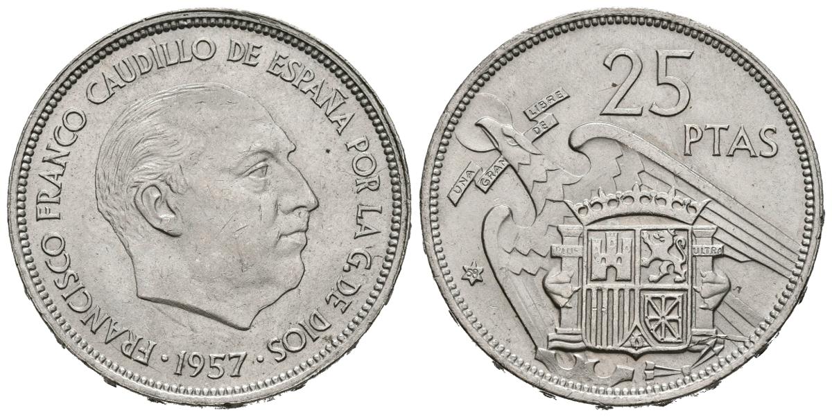 ESTADO ESPAÑOL (1939-1975). 25 Pesetas. (Ni. 8.55g /27mm). 1957 * 58. Madrid. (Cal-2019-116). SC-. Leves marquitas en anverso.