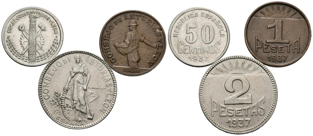 CONSEJO DE ASTURIAS Y LEON. Conjunto de tres valores acuñados por este Consejo: 50 Céntimos, 1 y 2 Pesetas. 1937. (Cal-2019-8/10). EBC.