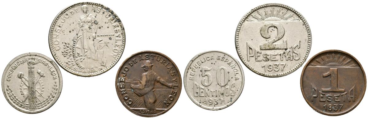 CONSEJO DE ASTURIAS Y LEON. Conjunto de tres valores acuñados por este Consejo: 50 Céntimos, 1 y 2 Pesetas. 1937. (Cal-2019-8/10). Diferentes estados de conservación. A EXAMINAR