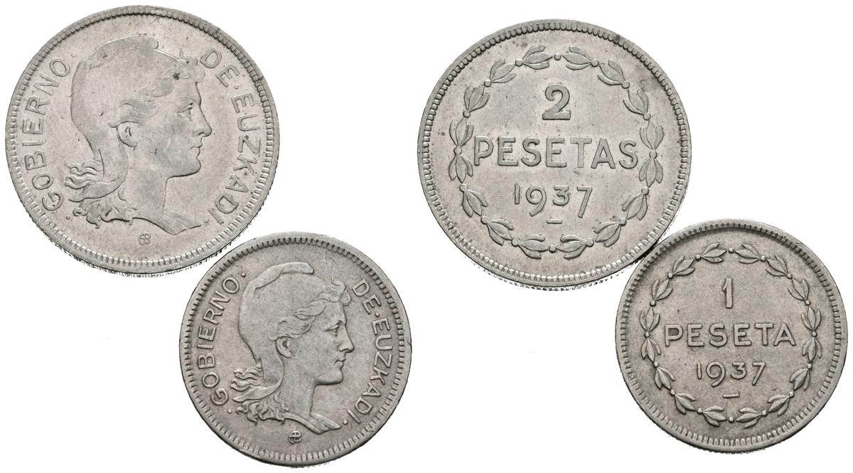 EUZKADI. Serie completa en níquel con los valores de 1 y 2 Pesetas. 1937. (Cal-2019-14/15). MBC+.