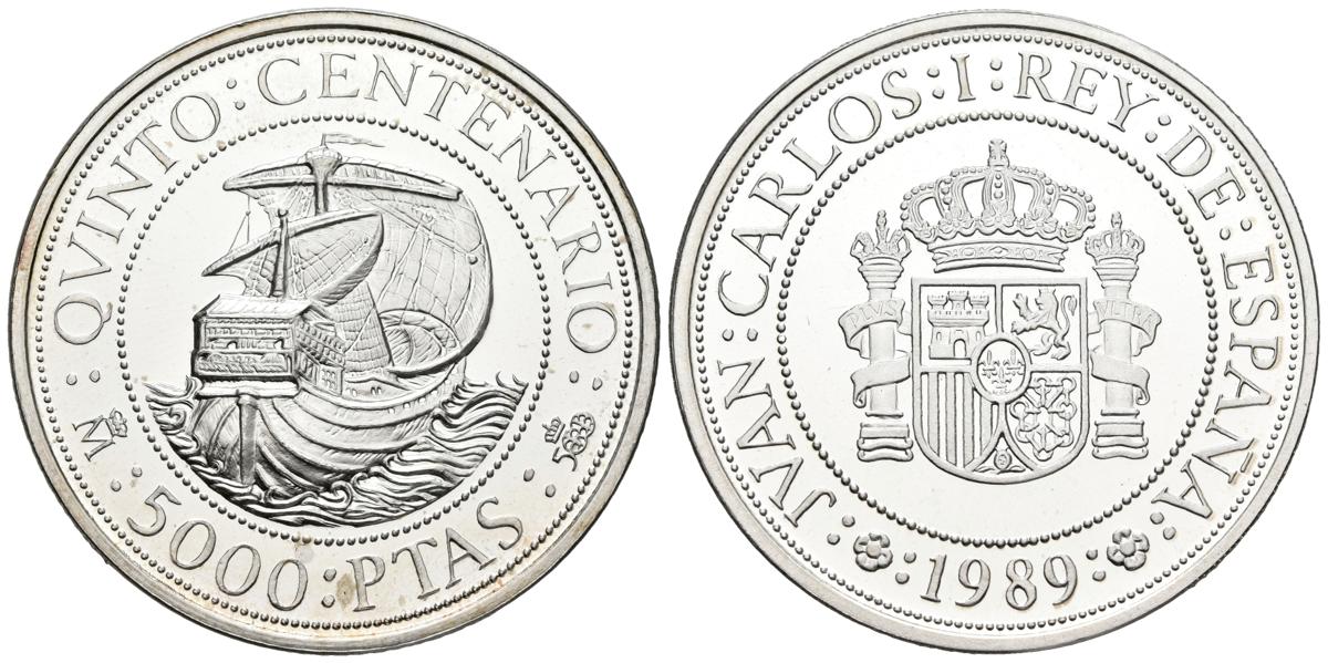 JUAN CARLOS I (1975-2014). 5000 pesetas. (Ar. 54.00g /40mm). 1989. FNMT. Quinto Centenario. Serie I. PROOF. Incluye estuche original y certificado de autenticidad.