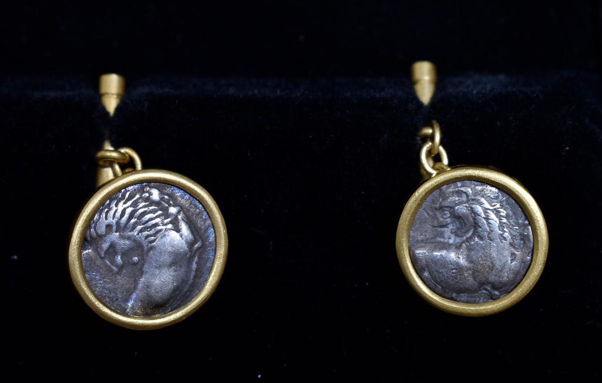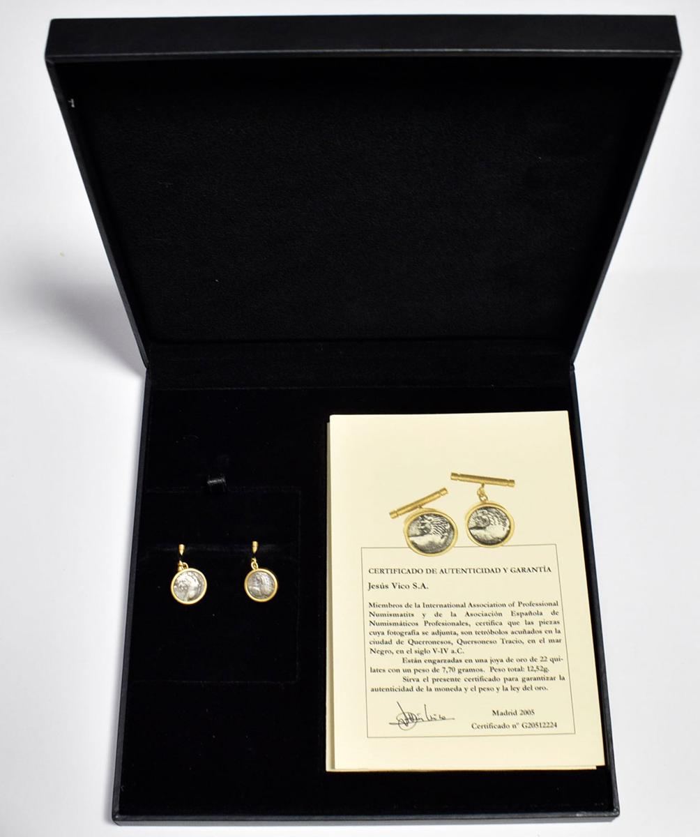GRECIA ANTIGUA. Dos Tetróbolos acuñados en Chersonesos entre los siglos V-IV a.C., ambos engarzados en oro de 22 Kilates con un peso total de 7,70 gramos. Peso total: 12,52g. Contiene certificado de autenticidad de Jesús Vico. MBC+.