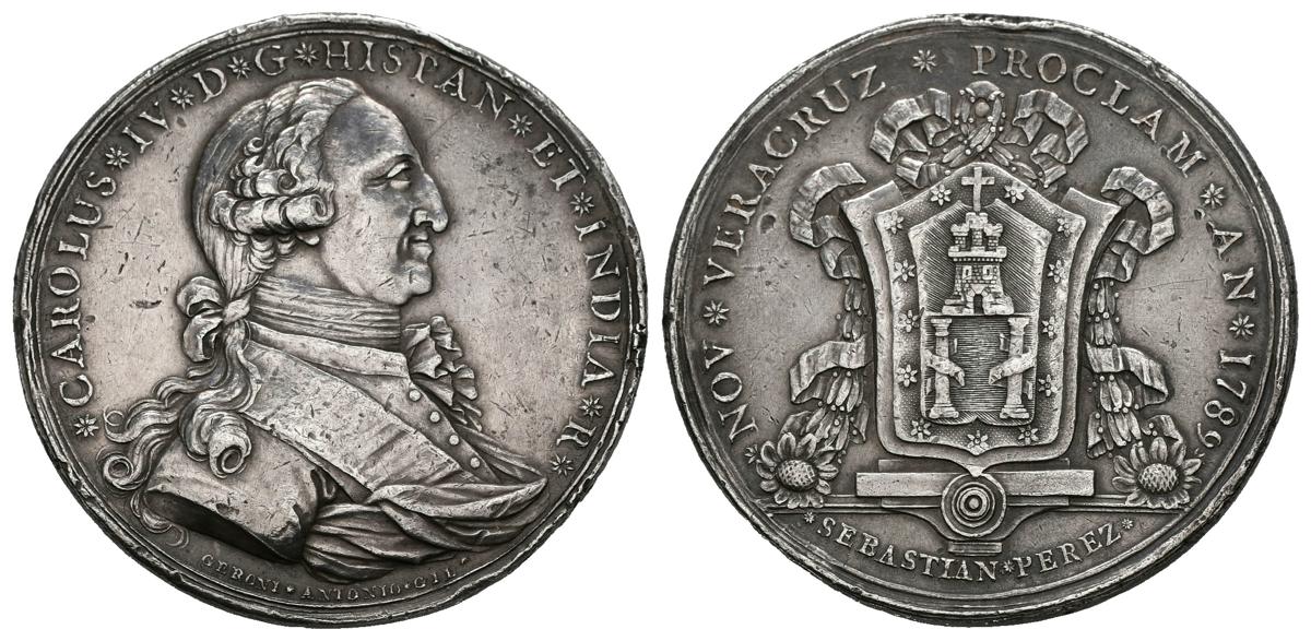 CARLOS IV (1788-1808). Proclamación en Veracruz, México. (Ar. 30,04g/40mm). 1789. Grabador: G. A. Gil. (Vives 717 var; RAH 273 var). Anv: Busto de Carlos IV con casaca, camisa con chorrera, banda y manto, alrededor leyenda: CAROLUS IV D G HISPAN ET INDIA R. Rev: Escudo sobre repisa, cortado con castillo y encima cruz, sobre las dos columnas de Hércules con cintas y la inscripción: PLVS-VLTRA, alrededor trece estrellas y adornos exteriores con festones de hojas de laurel rematados con grandes margaritas entrelazados con cintas, alrededor leyenda: NOV VEREACRUZ PROCLAM AN 1789, en exergo: SEBASTIAN PEREZ. EBC-. Escasa. Golpecito en el canto.