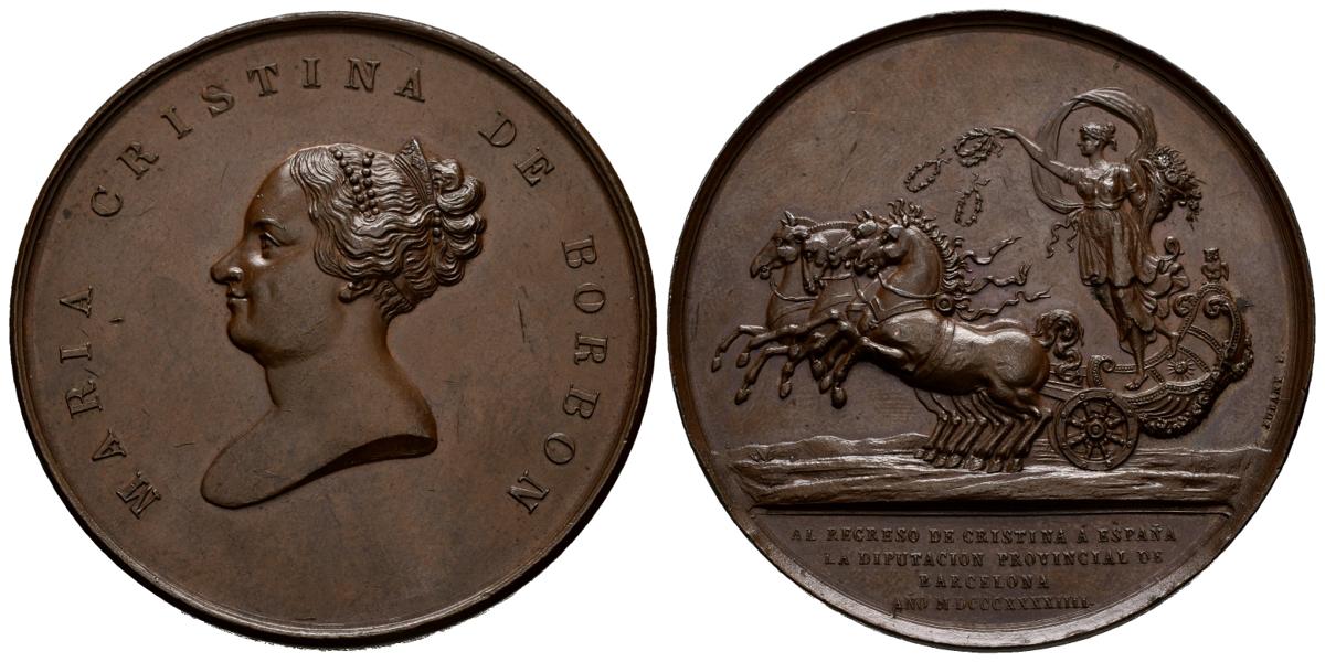 ISABEL II (1833-1868). Regreso de María Cristina de Borbón. (Ae. 59,07g/52mm). 1844. Acuñada por la Diputación Provincial de Barcelona. Grabador: Jubany. (Cru. Medalles 549). EBC. Escasa.
