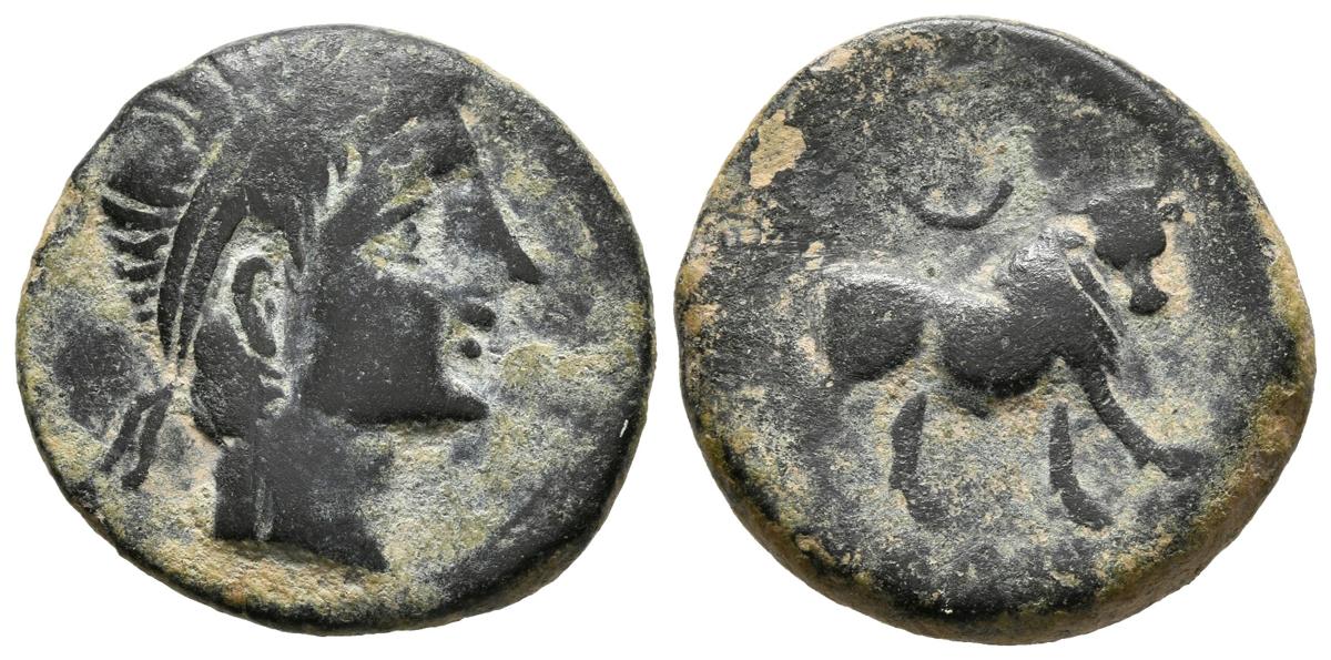 CASTULO (Cazlona, Jaén). Semis. (Ae. 5,49g/20mm). 180 a.C. (FAB-716). Anv: Cabeza masculina diademada a derecha. Rev: Toro parado a derecha, encima creciente, debajo leyenda: CaSTeLE. MBC.
