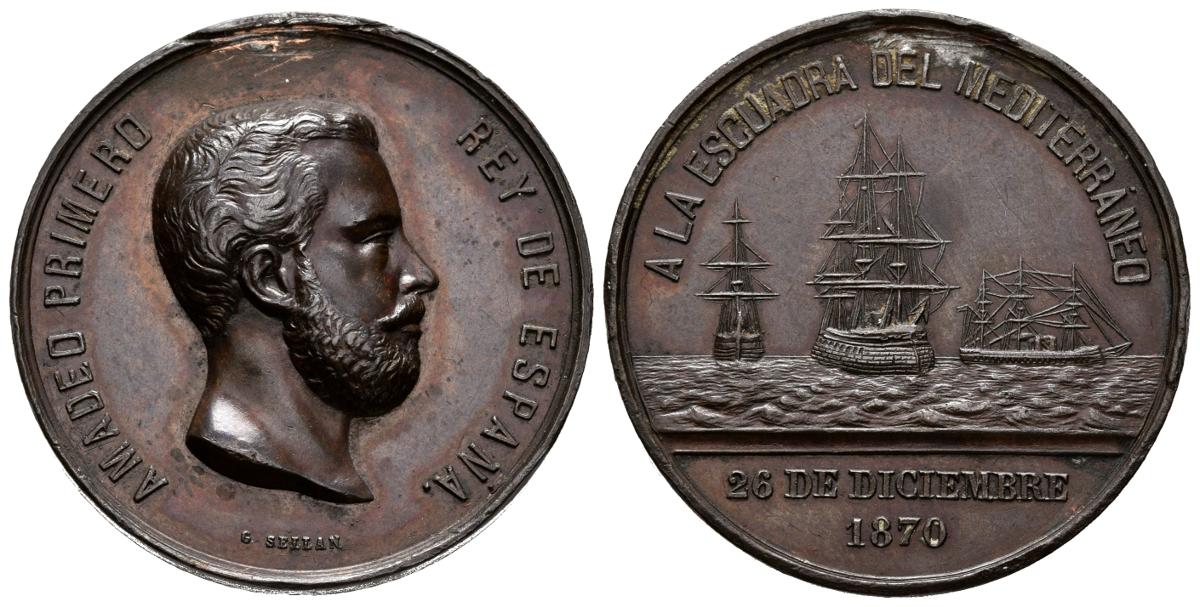 AMADEO I (1871-1873). A la Escuadra del Mediterráneo. Viaje a España del nuevo rey. (Ae. 15,88g/29mm). 26 de Diciembre de 1870. Grabador: G. Sellán. (VQ 14379). EBC-. Corona quitada, marca en la zona. Rara.El nuevo rey llegaría vía marítima al puerto de Cartagena un 30 de diciembre de 1870. Unos días más tarde el 2 de enero de 1871, Amadeo presentaba en la basílica de Atocha de Madrid, su respeto y condolencia ante la tumba de Prim, su principal valedor y que había sido asesinado unos días antes. Presentado por sus partidarios como un impulsor del progresismo y la modernidad, el primer “rey demócrata” de nuestra historia nunca contó con el suficiente apoyo político ni de importantes capas de la sociedad para consolidad su reinado.
