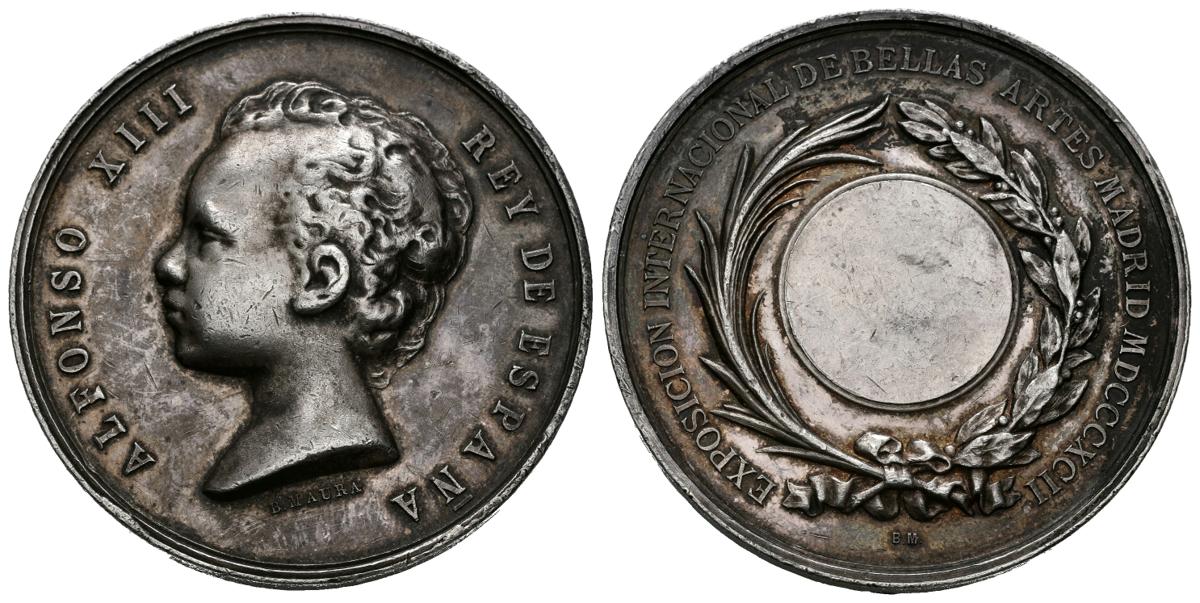 ALFONSO XIII (1885-1931). Exposición Internacional de Bellas artes. (Ar. 64,38g/50mm). 1892. Madrid. Grabador: Bartolomé Maura. (Catálogo de Medallas Españolas, Madrid: Museo Nacional del Prado, 2005, p. 313). MBC+. Escasa.