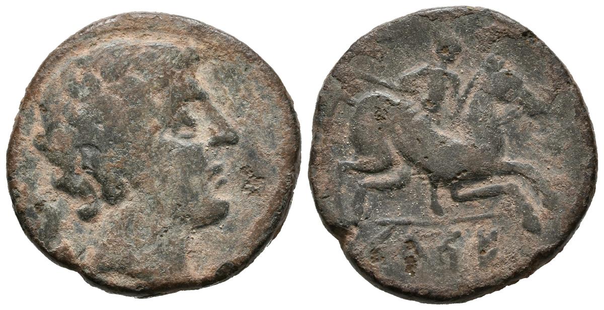 CELSE (Velilla del Ebro, Zaragoza). As. (Ae. 9,57g/25mm). 120-50 a.C. (FAB-778). Anv: Cabeza masculina a derecha, detrás delfín. Rev: Jinete con lanza a derecha, debajo leyenda ibérica: CeLSE. MBC-. Escaso.