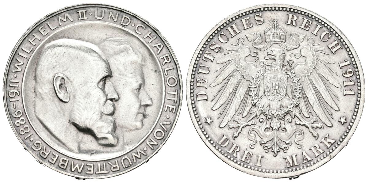 ALEMANIA. 3 Mark (Ar. 16,65g/33mm). 1911. Stuttgart F. Imperio Alemán. 25 Aniversario Boda de Guillermo II de Wurtemberg y Carlota de Schaumburg-Lippe. (Km#636). EBC.