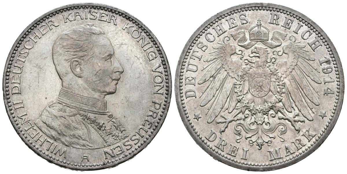 ALEMANIA (Prusia). 3 Mark. (Ar. 16,62g/33mm). 1914. Berlín A. (Km#536). MBC+. Bonito tono.