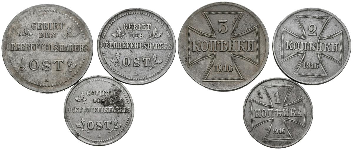 ALEMANIA. Conjunto de 3 monedas acuñadas durante la ocupación alemana de Rusia en la I Guerra Mundial. Valores de 1, 2 y 3 Kopek. 1916. Berlín. (Km#21-23). Diferentes estados de conservación. Escasas. A EXAMINAR.