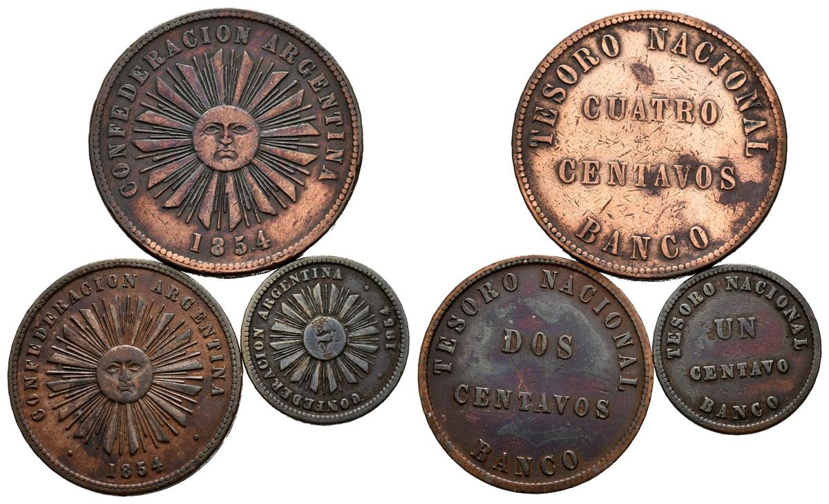 ARGENTINA. Interesante conjunto de 3 monedas de cobre de 1, 2 y 4 Centavos de 1854 (Confederación Argentina). Birmingham. (Km#23-25). Diferentes estados de conservación. Escasas. A EXAMINAR.