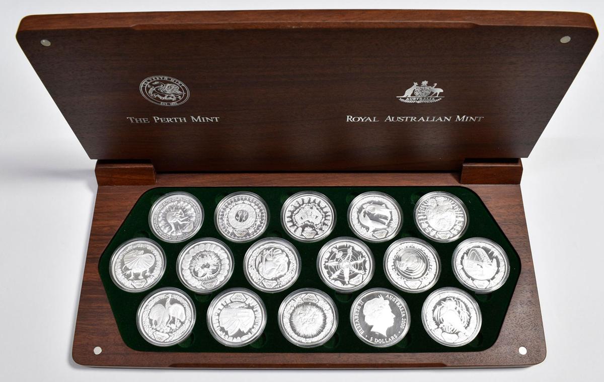 AUSTRALIA. Set completo compuesto por 16 monedas de plata de 5 Dólares conmemorativas de los Juegos Olímpicos de Sydney 2000. Perth. Royal Australian Mint. Peso y diametro medio por moneda: 31,60g/41mm. Peso total aproximado del conjunto en plata: 500g. Presentado con cápsulas y en estuche original de madera. PROOF.