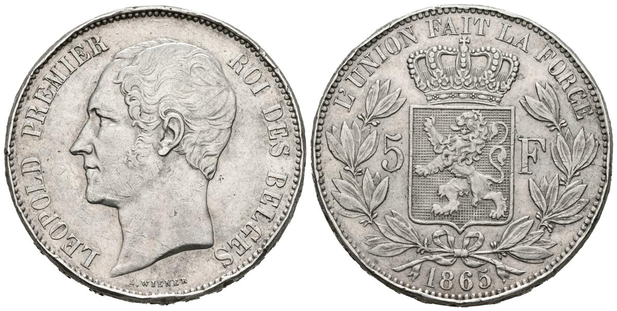 BÉLGICA. 5 Francos (Ar. 24,91g/37mm). 1865. Leopoldo I. (Km#17). MBC.