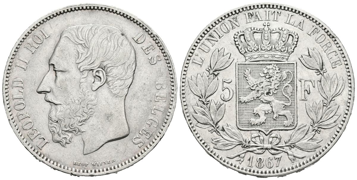 BÉLGICA. 5 Francos (Ar. 24.83g /37mm). 1867. Leopoldo II. (Km# 24). MBC+.