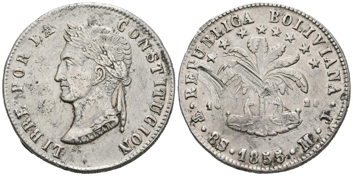 BOLIVIA. 8 Reales. (Ar. 26,17g/37mm). 1855. Potosí MJ. (Km#112.2). MBC. Golpes en reverso.