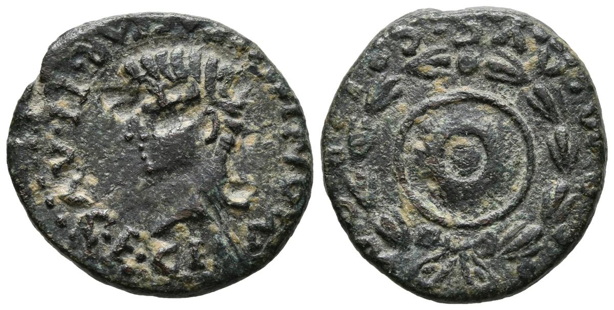COLONIA ROMULA (Sevilla). Semis. (Ae. 6,90g/23mm). 14-36 d.C. (FAB-2017). Anv: Cabeza desnuda de Germánico a izquierda, alrededor leyenda: GERMANICVS CAESAR TI AVG F. Rev: Rodela dentro de láurea, alrededor leyenda: PERM AVG COL ROM. MBC.