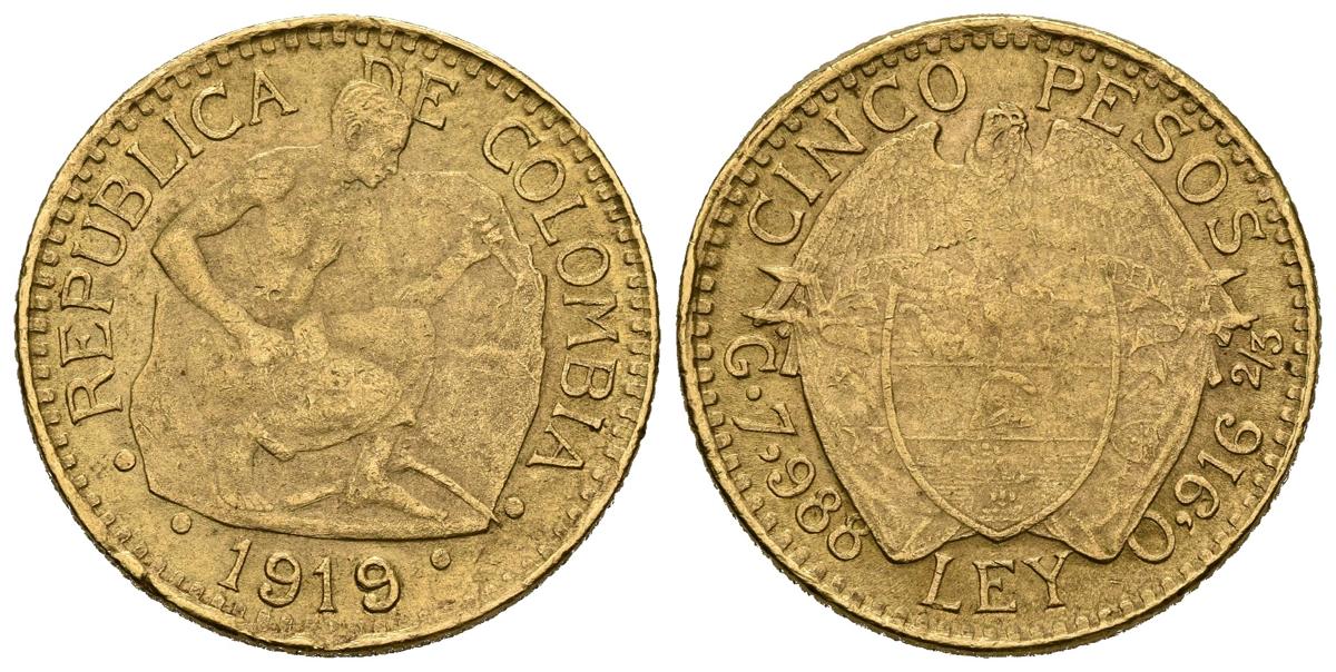 COLOMBIA. 5 Pesos. (Au. 7,95g/22mm). 1919. (Km#201.1). MBC-.