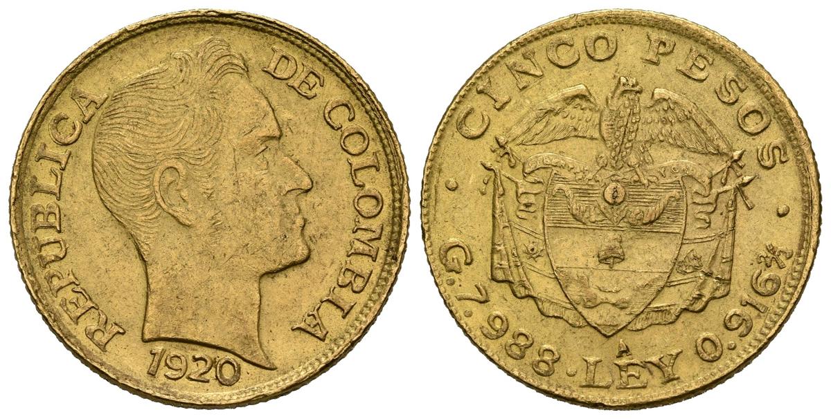 COLOMBIA. 5 Pesos. (Au. 8,03g/22mm). 1920. Medellín A. (Km#201.1). MBC+.