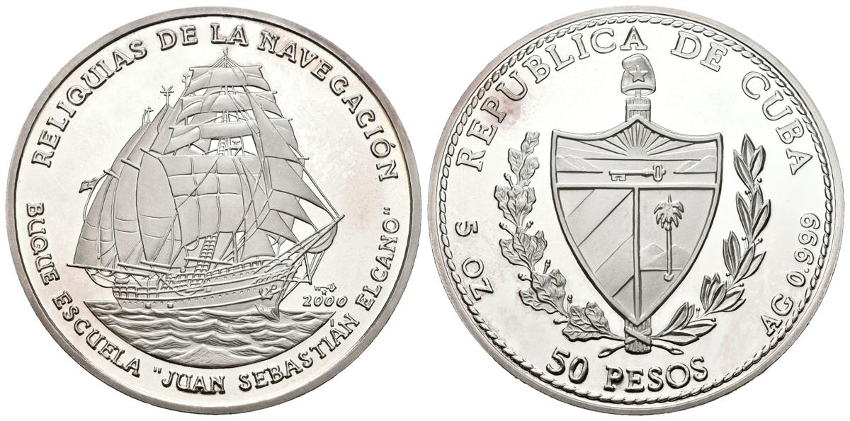 CUBA. 50 Pesos (Ar. 155,50g/65mm). 2000. Reliquias de la Navegación. Buque Escuela Juan Sebastián Elcano. (Km no cita). PROOF. Plata de 0.999.