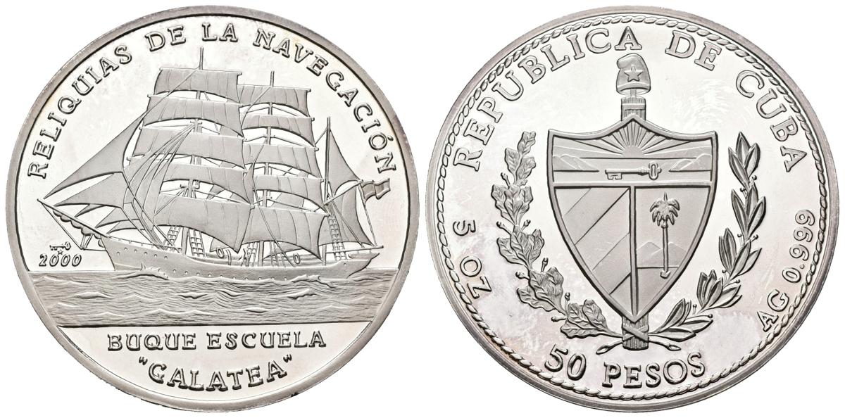 CUBA. 50 Pesos (Ar. 155,50g/65mm). 2000. Reliquias de la Navegación. Buque Escuela Galatea. (Km no cita). PROOF. Plata de 0.999.