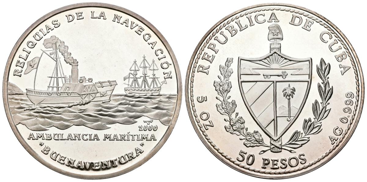 CUBA. 50 Pesos (Ar. 155,50g/65mm). 2000. Reliquias de la Navegación. Ambulancia Marítima Buenaventura. (Km no cita). PROOF. Plata de 0.999.
