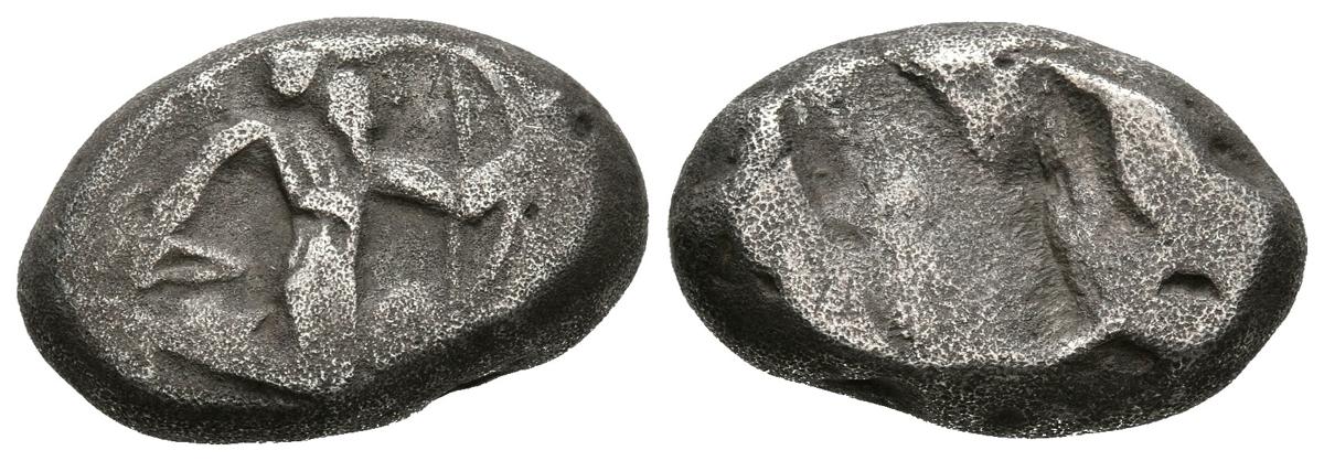 IMPERIO AQUEMENIDA, Tiempo de Xerxes I a Xerxes II. Siglos. (Ar. 5,23g/18mm). 485-420 a.C. Sardes. (BMC Arabia 22-25). Anv: Rey persa arrodillado a derecha portando arco y lanza. Rev: Incuso. MBC-.