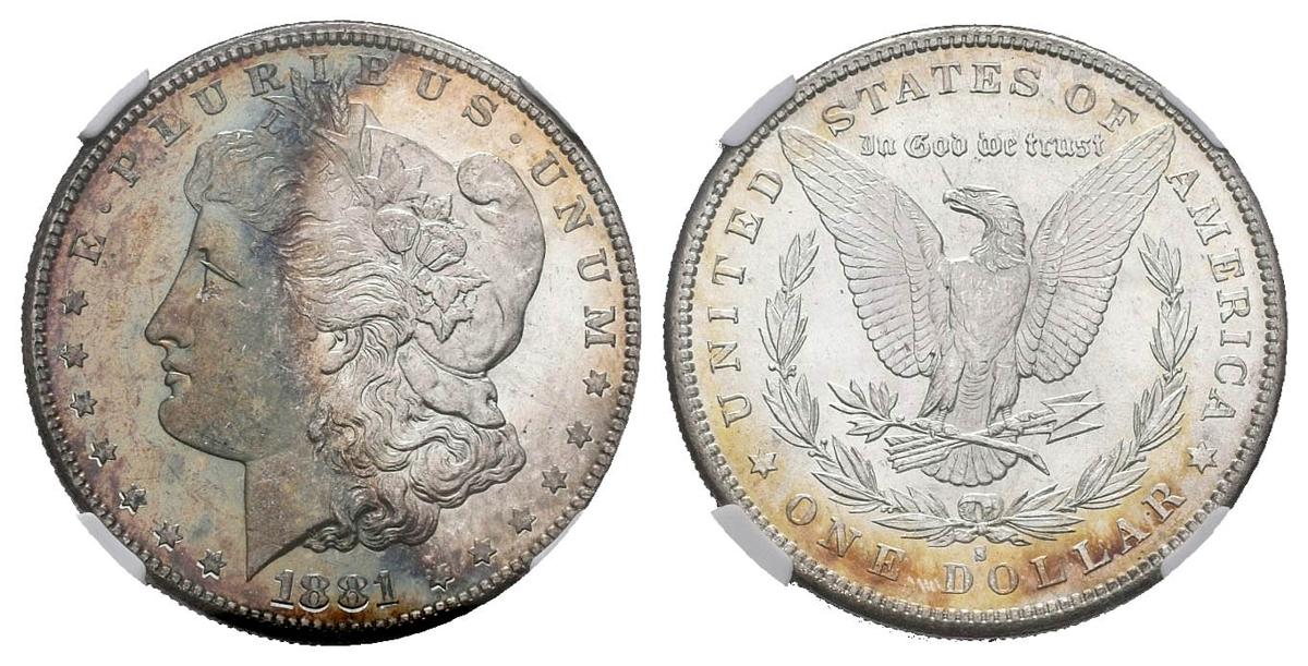 ESTADOS UNIDOS. 1 Dollar (Ar. 26,73g/38mm)*. 1881. San Francisco S. (Km#110). MS 62. Encapsulado por NGC. *Peso y medida teórico.