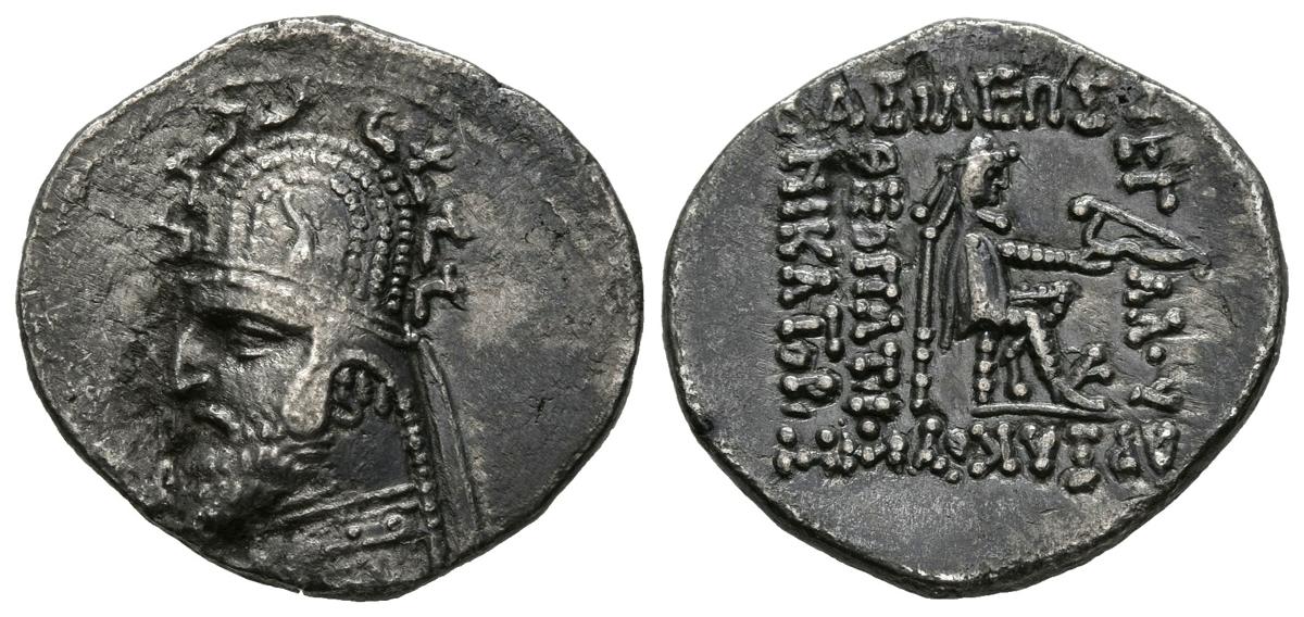 IMPERIO PARTO, Phraates III. Dracma. (Ar. 3,64g/14mm). 70-57 a.C. Ray. (Sellwood 39/13). Anv: Busto con casco ornamentado y con coraza de Praates III a izquierda. Rev: Arquero sentado a izquierda, alrededor leyenda griega. MBC+.