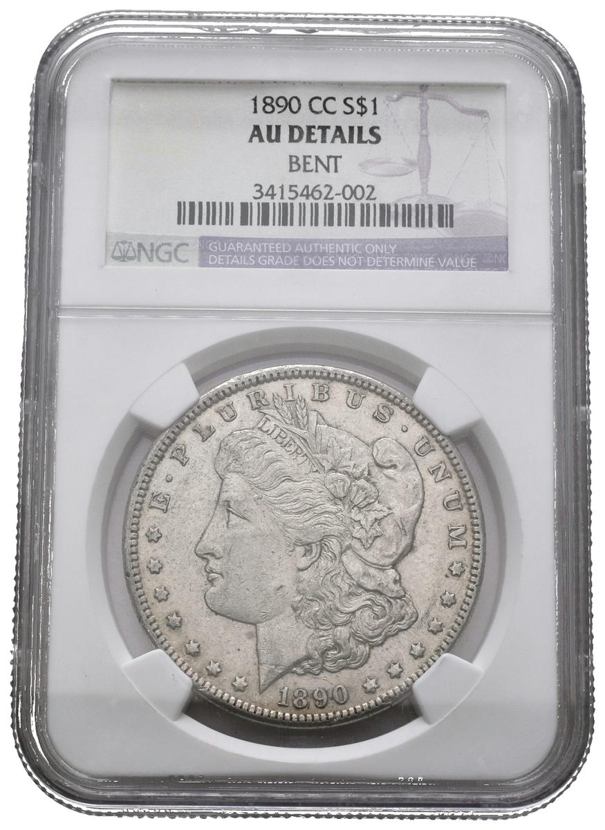 ESTADOS UNIDOS. 1 Dollar (Ar. 26,73g/38mm)*. 1890. Carson City CC. (Km#110). AU Details. Moneda algo curvada. Encapsulado por NGC. *Peso y medida teórico.