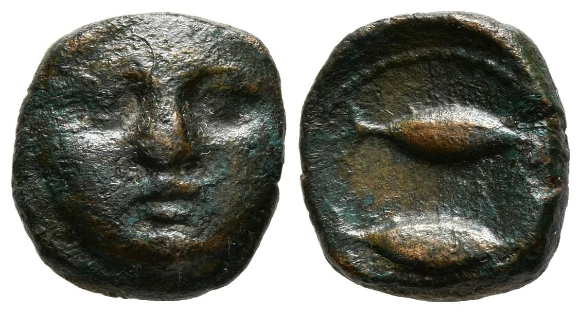 GADES (Cádiz). 1/2 Calco. (Ae. 2,01g/12mm). 200-100 a.C. (FAB-1333). Anv: Cabeza de frente. Rev: Dos atunes a izquierda. MBC-.