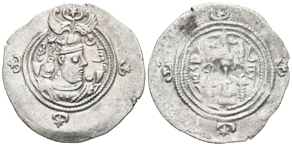IMPERIO SASANIDA, Khusro II. Dracma. (Ar. 3,83g/31mm). Año 3. ¿Nal?. (Böbl-II/3). Anv: Busto coronado de Khusro II a derecha dentro de orla. Rev: Altar con fuego entre dos guardias, entre estrella y creciente. MBC.