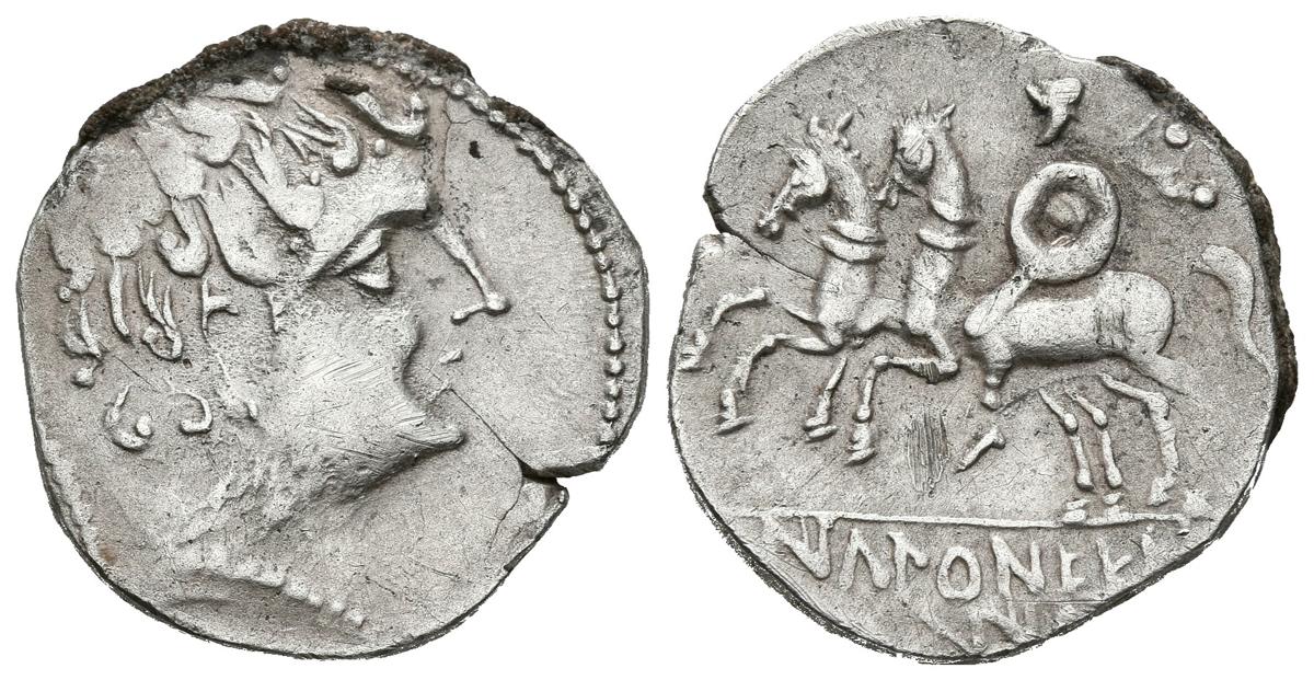 Dos caballos y un solo jinete que porta, en lugar de la tradicional palma, una caetra (escudo típico celta) son los elementos más característicos de estas piezas cuya representación ha sido tradicionalmente atribuida a los Dioscuros. Un jinete que siempre cabalga a la izquierda enseñando el escudo mientras que con la mano derecha guía al otro caballo. La gran cantidad de denarios acuñados bajo esta ceca responde a su prolongada acuñación a lo largo y ancho de todo el siglo II a.C con el objetivo de sufragar los pagos de las tropas que combatían las continuas revueltas lusitanas y celtíberas.