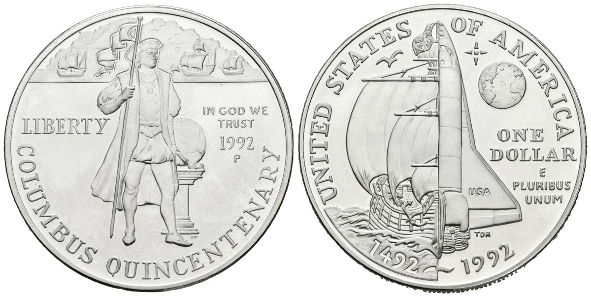 ESTADOS UNIDOS. 1 Dollar (Ar. 26,93g/38mm). 1992. Philadelphia. P. 500 aniversario viaje de Colón. (Km#238). SC.